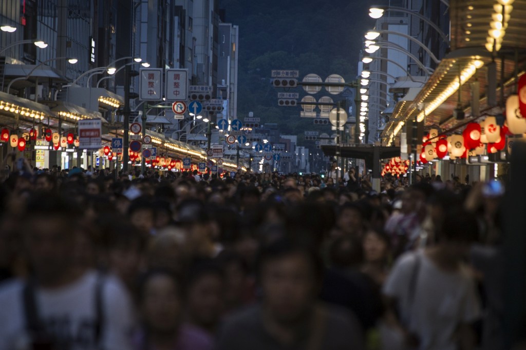We winkelen ook nog wat, halen nog wat matcha poeder voor mee te nemen naar huis en mengen ons in de massa mensen op de autovrije straten die zijn afgezet wegens het ‘Gion Matsuri festival’, het belangrijkste festival van Japan.